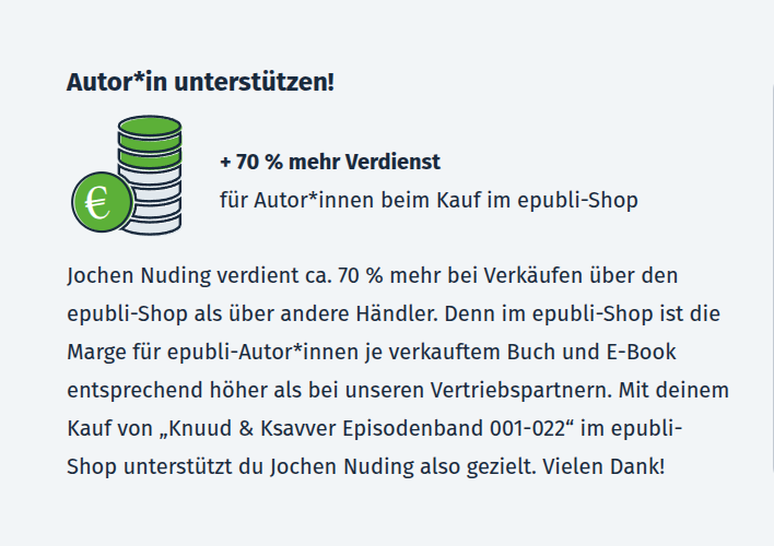 Das würde auch meine Bücher dort bekannter machen und dir das Porte gegenüber der Bestellung bei ePubli direkt ersparen, aber eben auch mein Honorar mehr als halbieren je Exemplar.